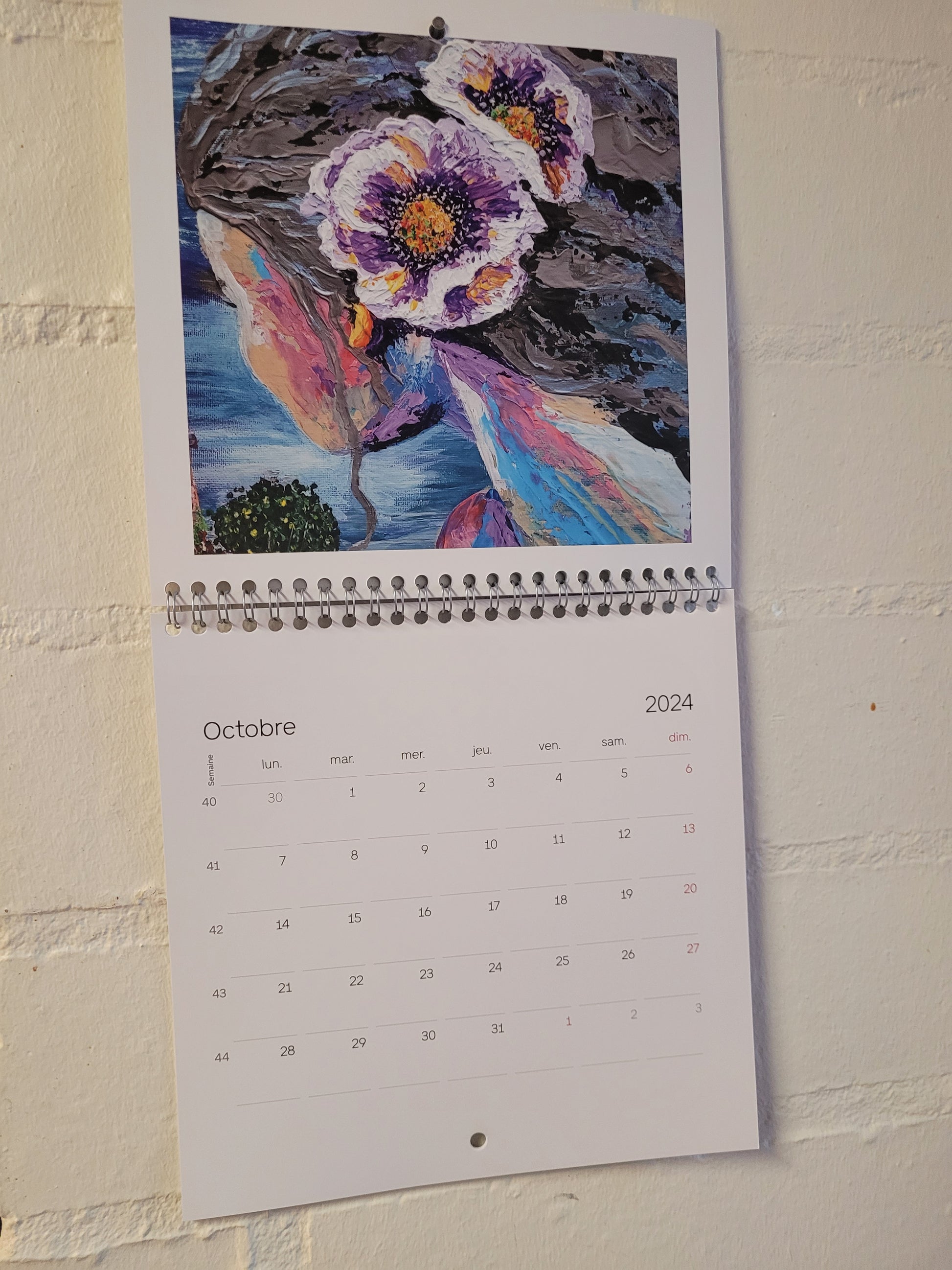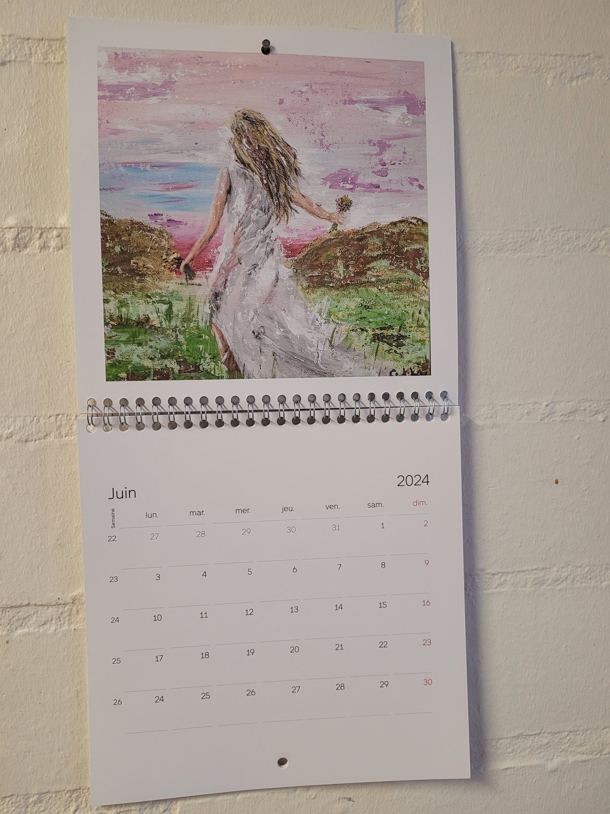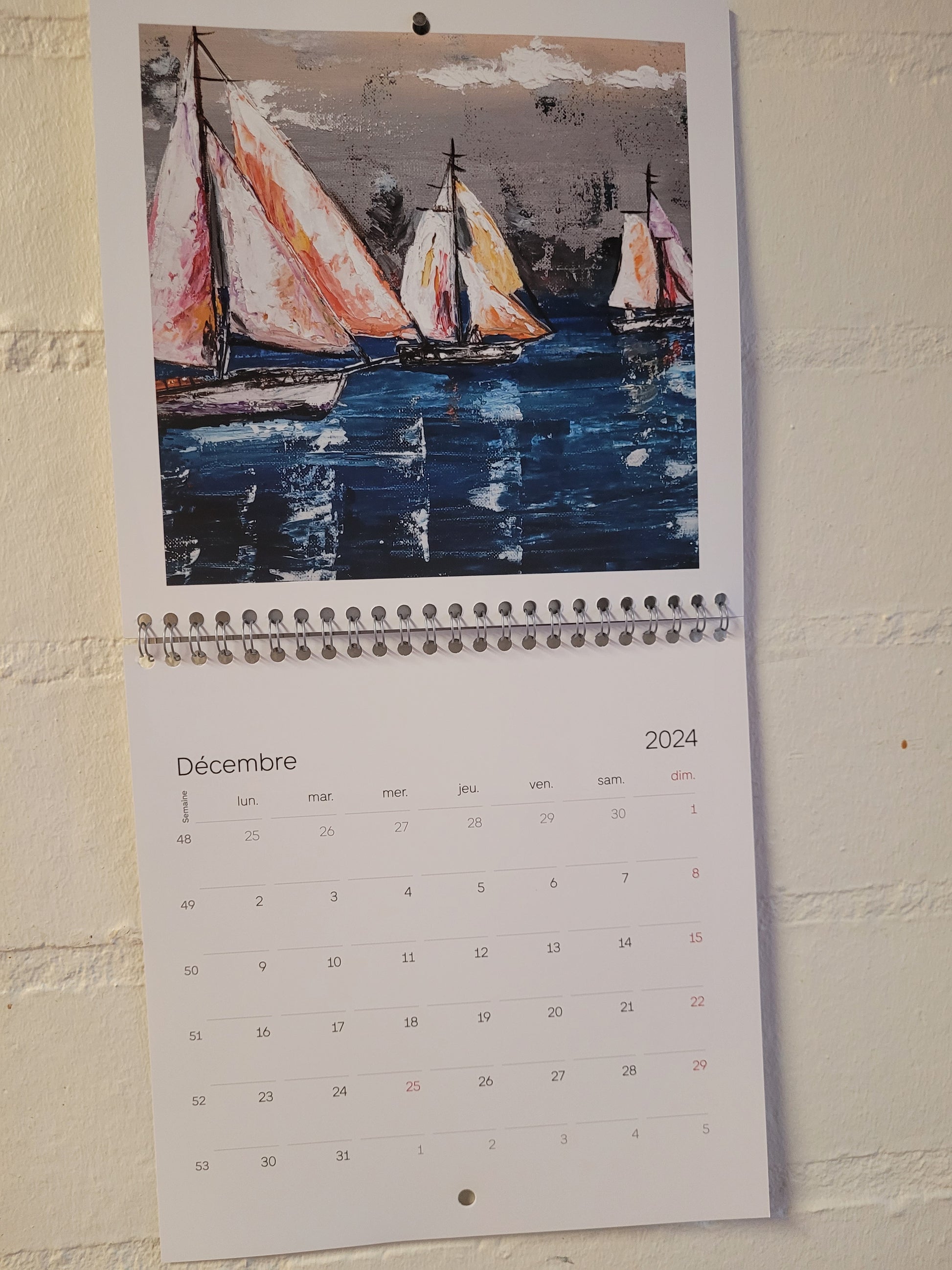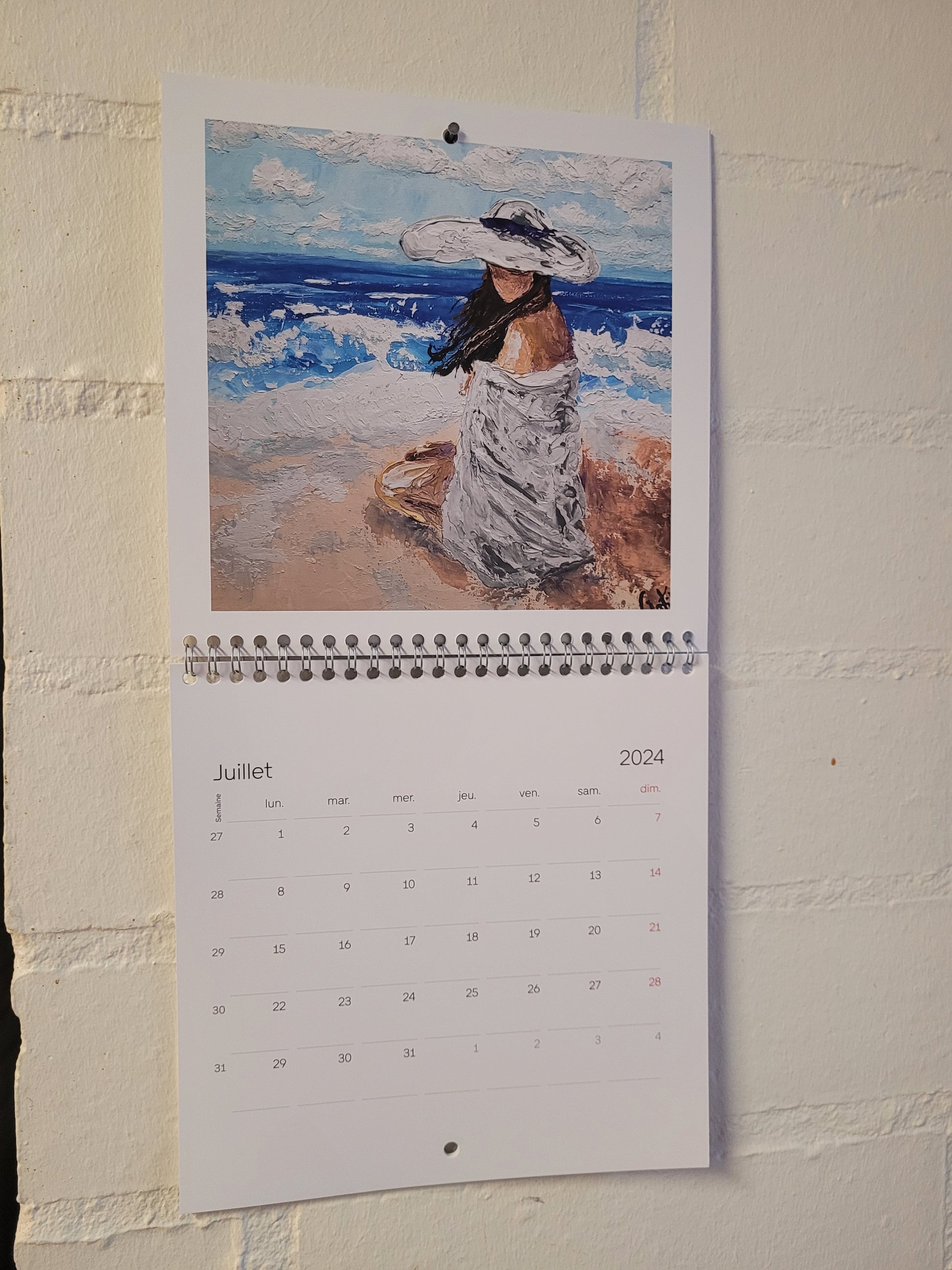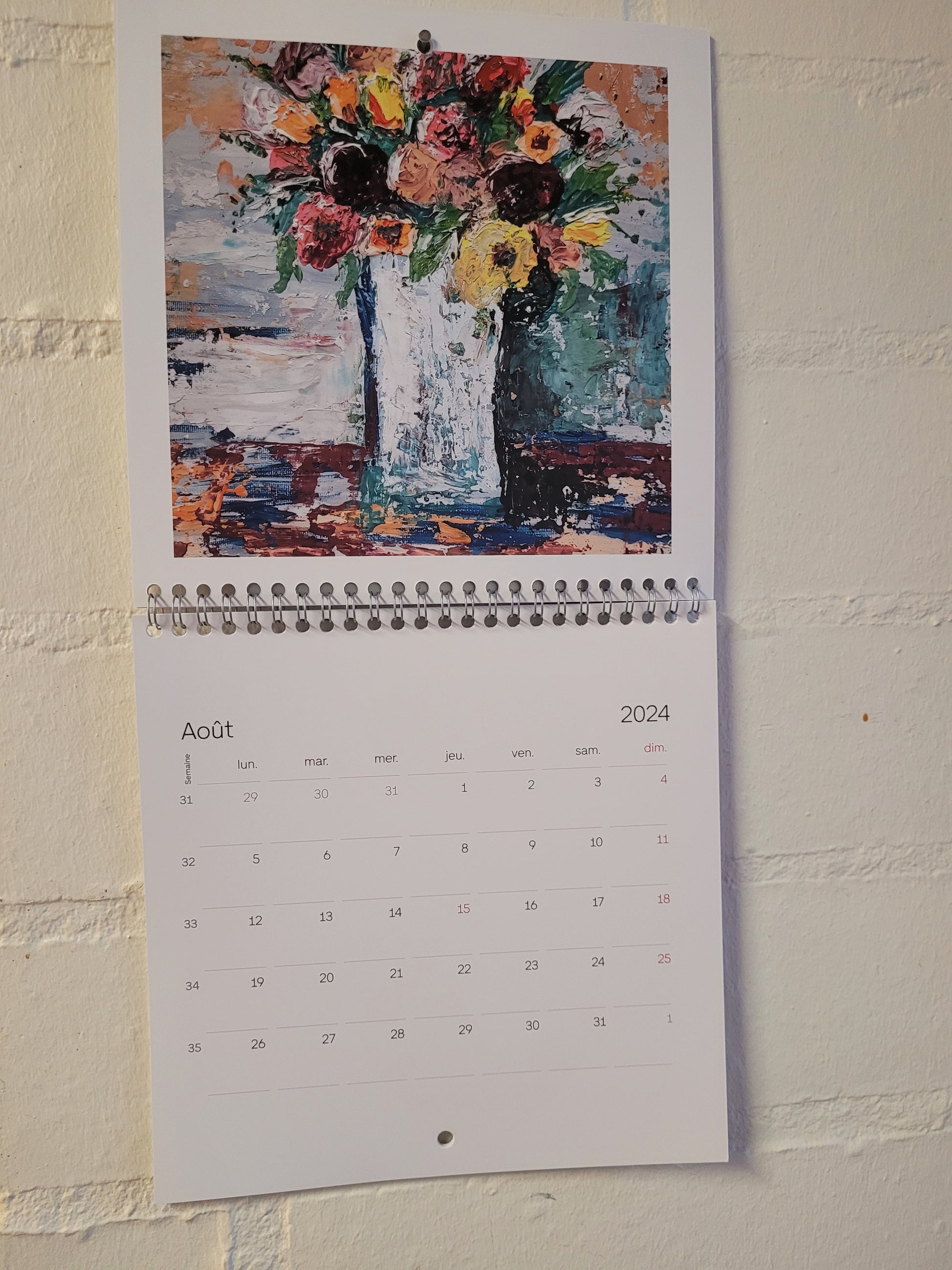 Calendario 2024 con 13 páginas. Tamaño 21x21cm, 42x22 desplegado. Tiene una obra en cada mes. Están en francés los meses.