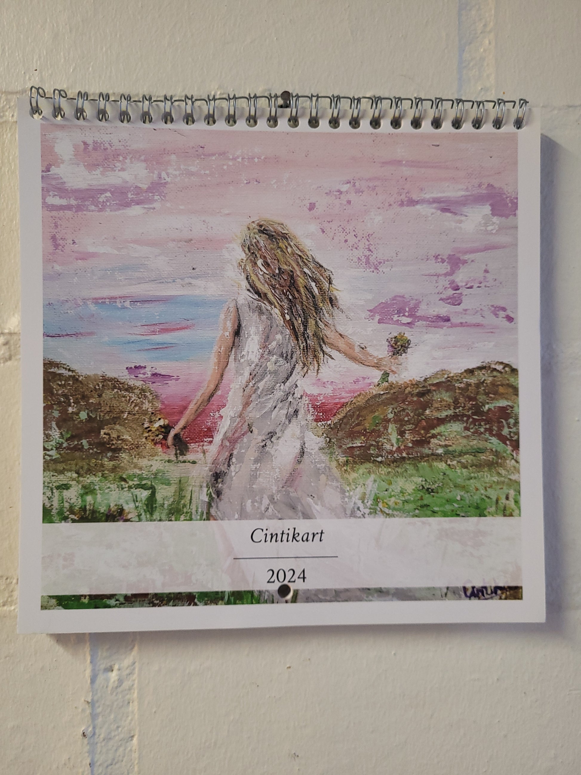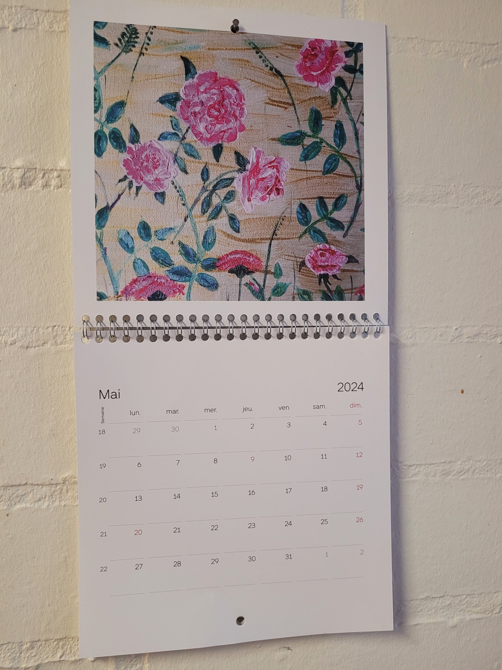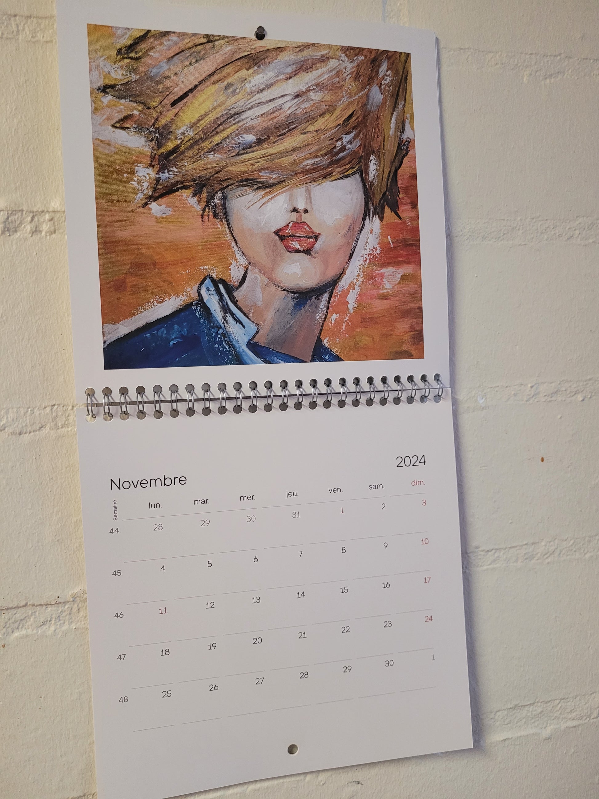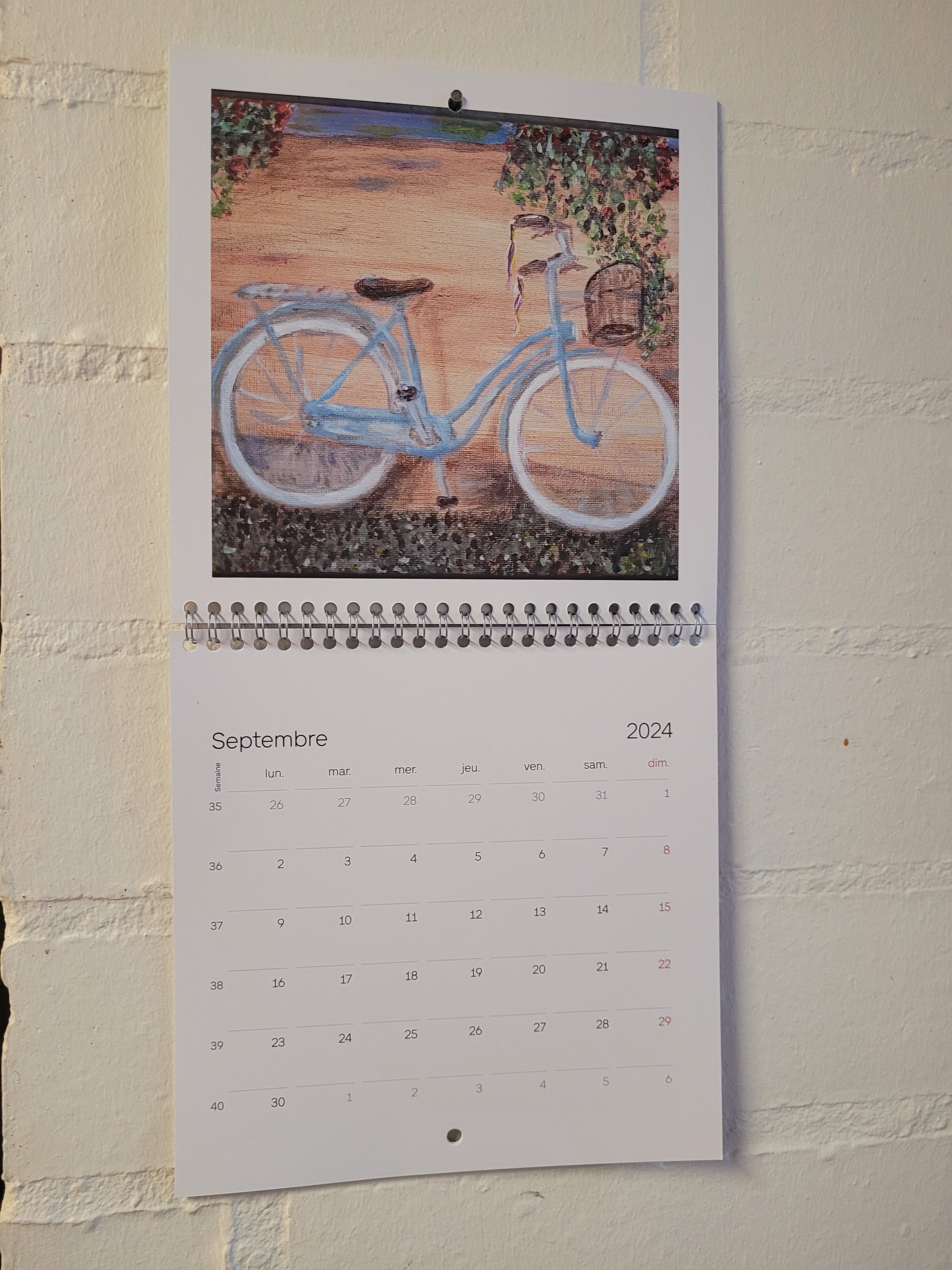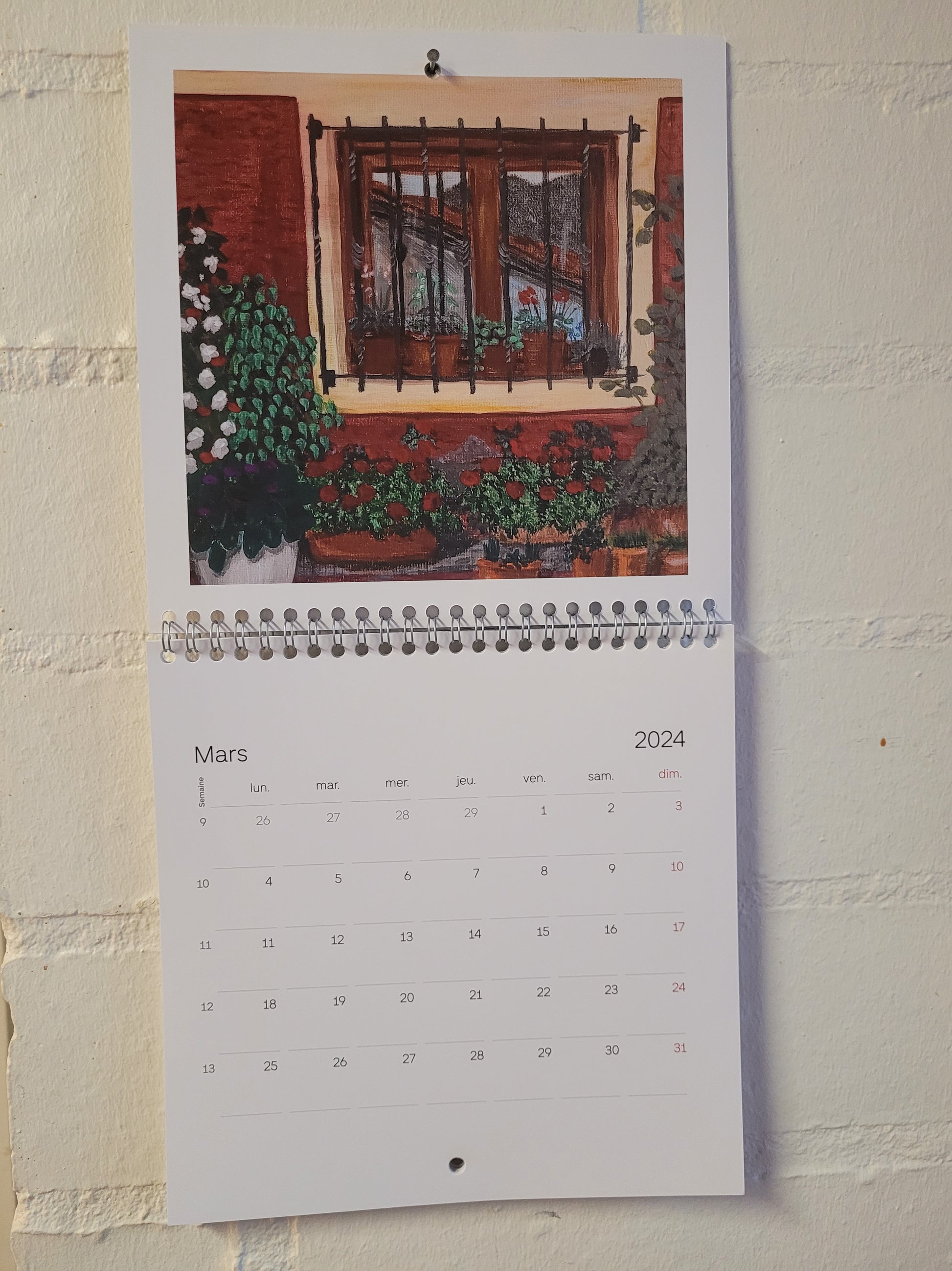 Calendario 2024 con 13 páginas. Tamaño 21x21cm, 42x22 desplegado. Tiene una obra en cada mes. Están en francés los meses.